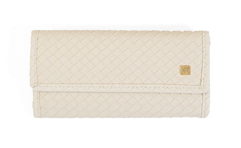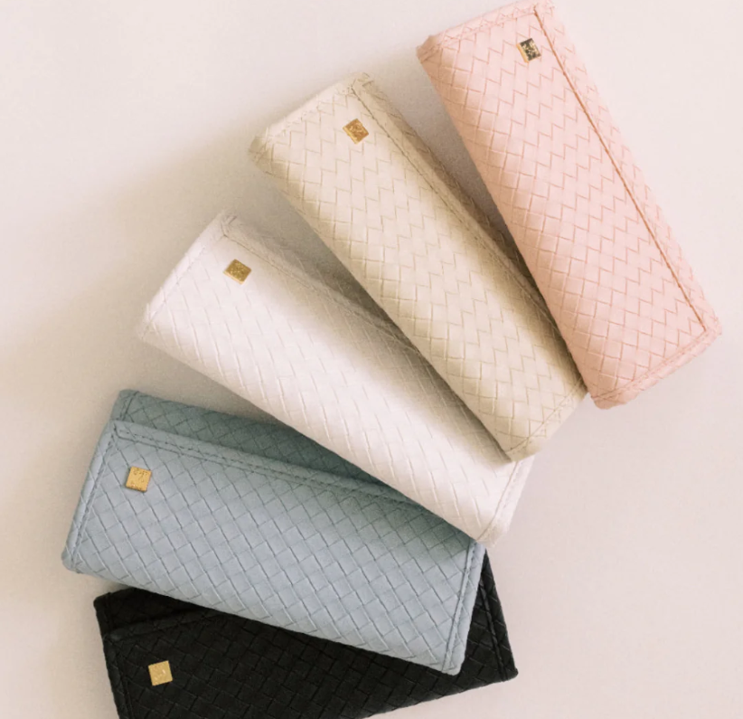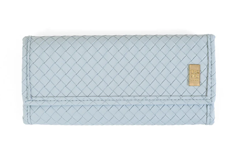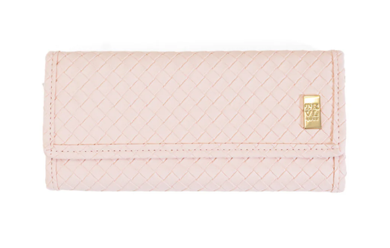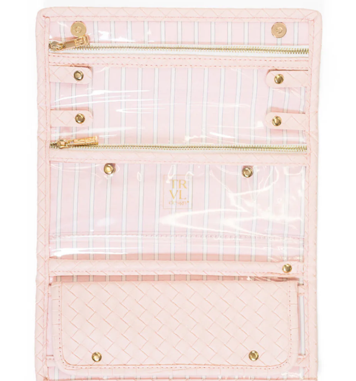 Attention globetrotters, take our Jewelry Wallet wherever you go while keeping your jewelry in place whether - business, leisure, and everything in between.  Our sleek, high functioning wallet has 2 inside zip pockets, snap tabs for chains, a pendant pouch, ring roll and earring bar with a protective flap.  Lined in our New chic pink pinstripe cotton!