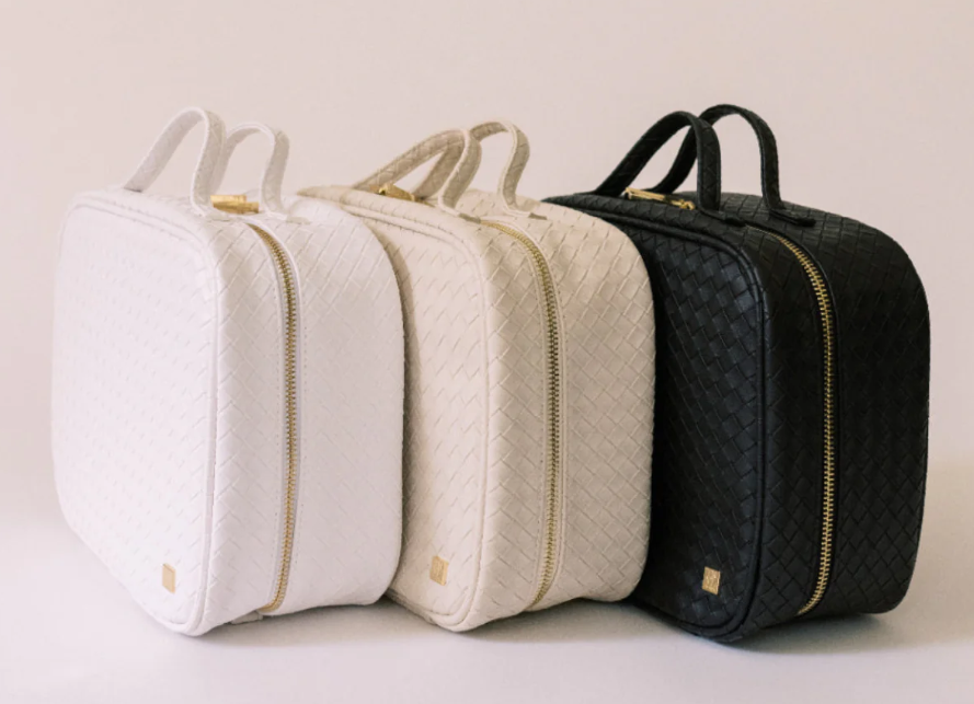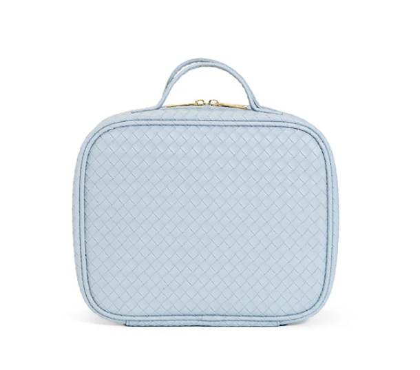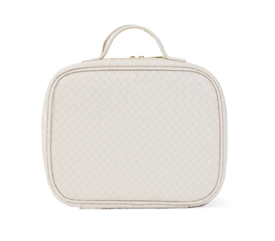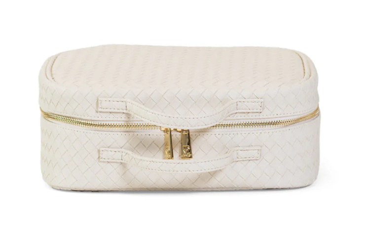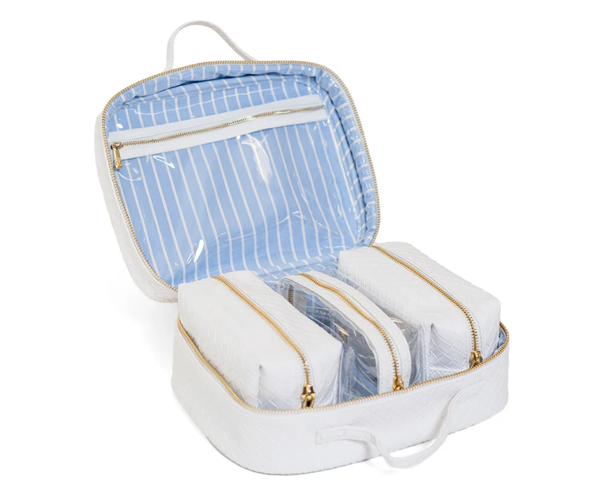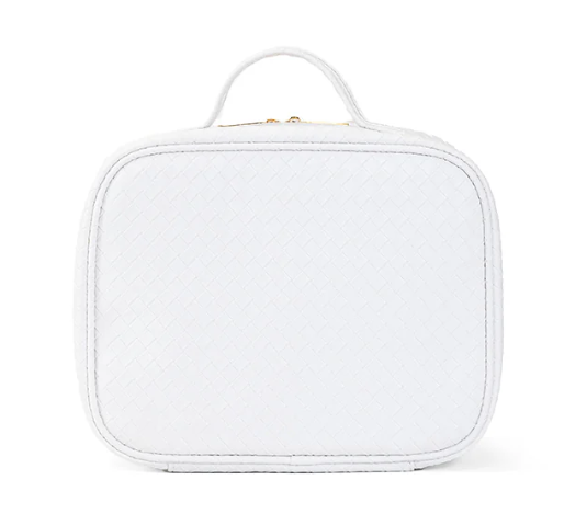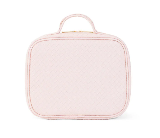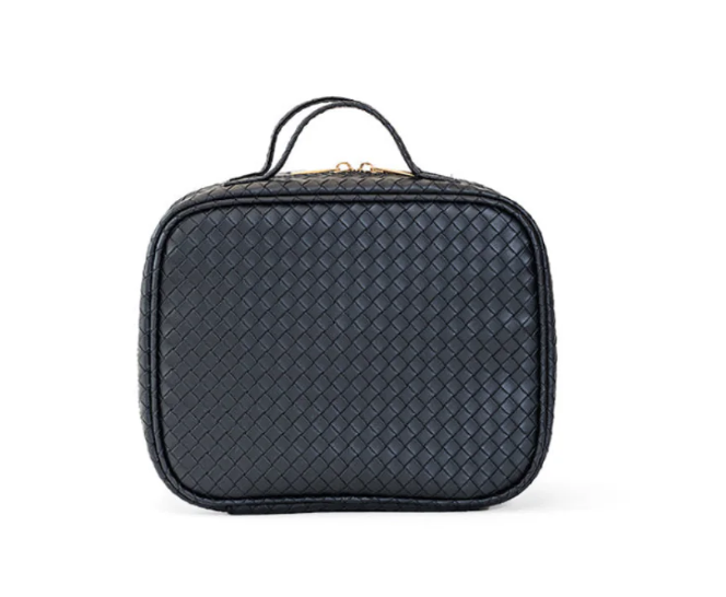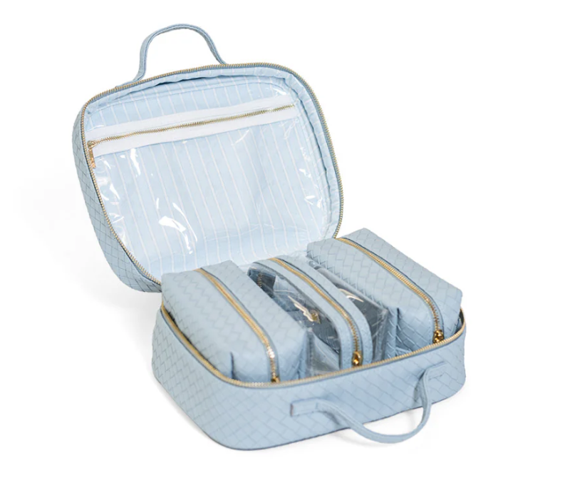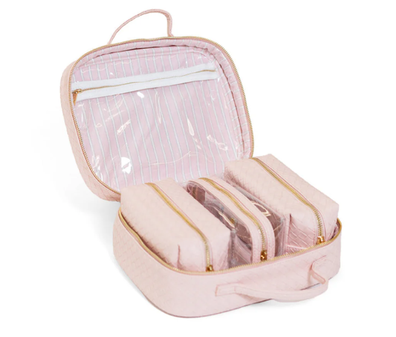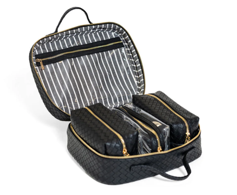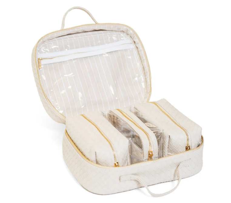 The Luxe Woven TRVL2 Cosmetic Case is a polished update to a classic - crafted in our textured vegan woven with a wipeable finish and lined in our coordinating pinstripe interior. Spacious and organized with 3 removable pouches, a zip pocket, and chic gold hardware, it's the ultimate travel-ready essential.